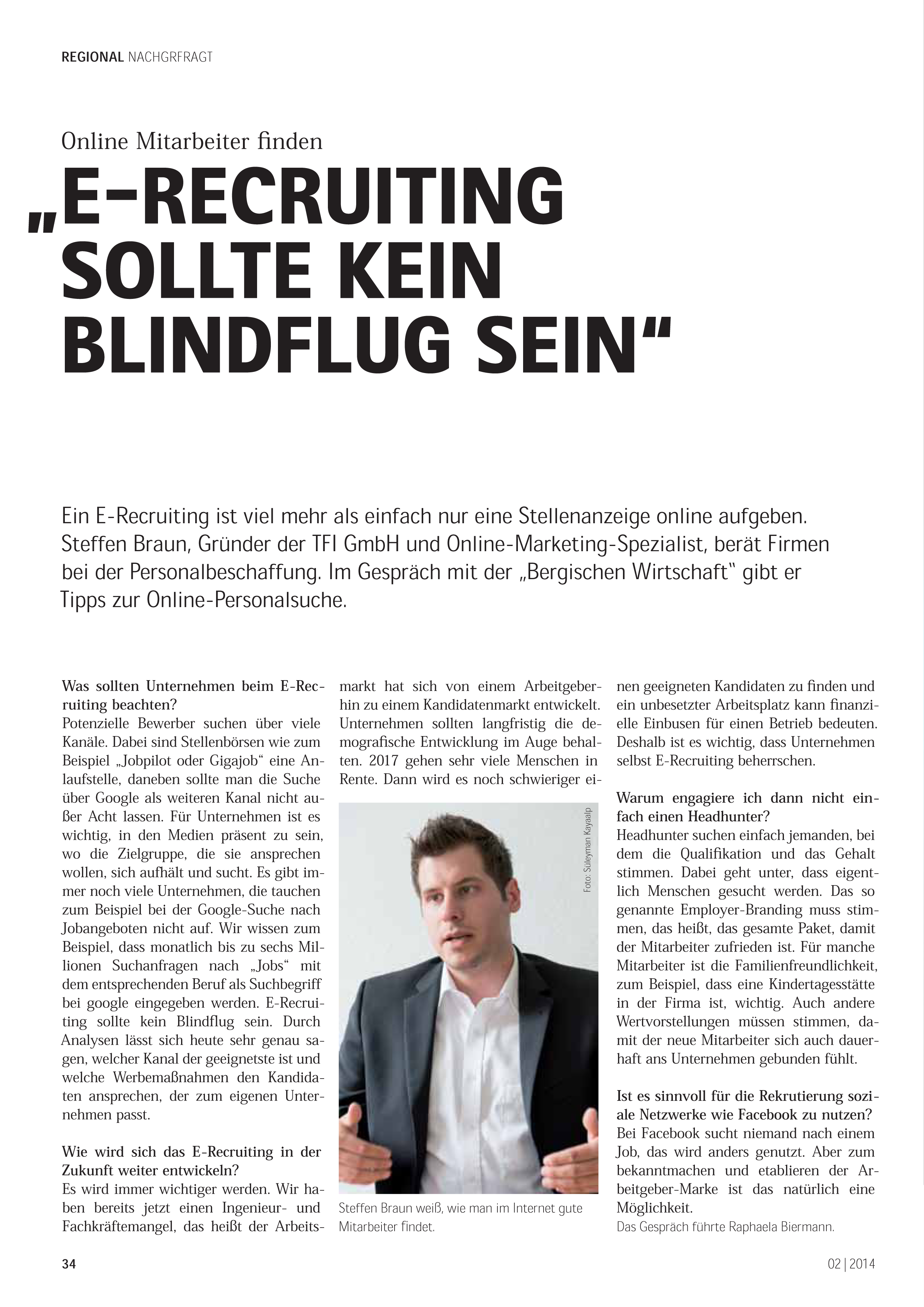 In der aktuellen Ausgabe der "Bergischen Wirtschaft" (02/2014) gibt Steffen Braun, einer der Gründer der TFI GmbH und Experte auf dem Gebiet E-Recruiting und Personalmarketing, in einem Interview mit der IHK Wuppertal, Tipps zur Online-Personalsuche.